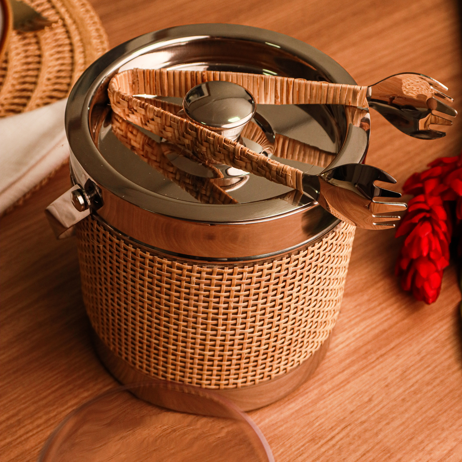 Fabricado em aço inox 14/1 com acabamento em rattan, oferece durabilidade, resistência e um visual refinado. Acompanha pegador no mesmo padrão, garantindo praticidade e higiene no manuseio do gelo.