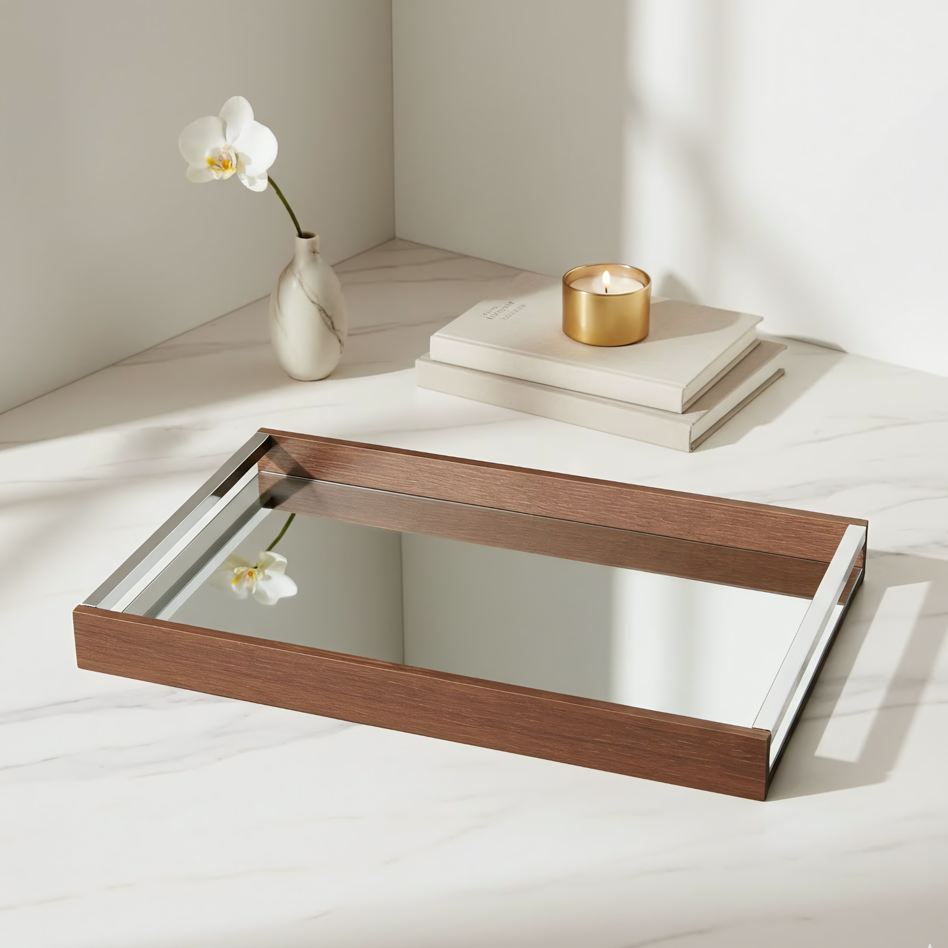 Um toque natural com reflexos de sofisticação. Esta bandeja combina a rusticidade da madeira com o charme dos detalhes espelhados, criando um ponto de destaque acolhedor e elegante em qualquer ambiente. Perfeita para compor bandejas decorativas com velas, vasos ou objetos especiais.