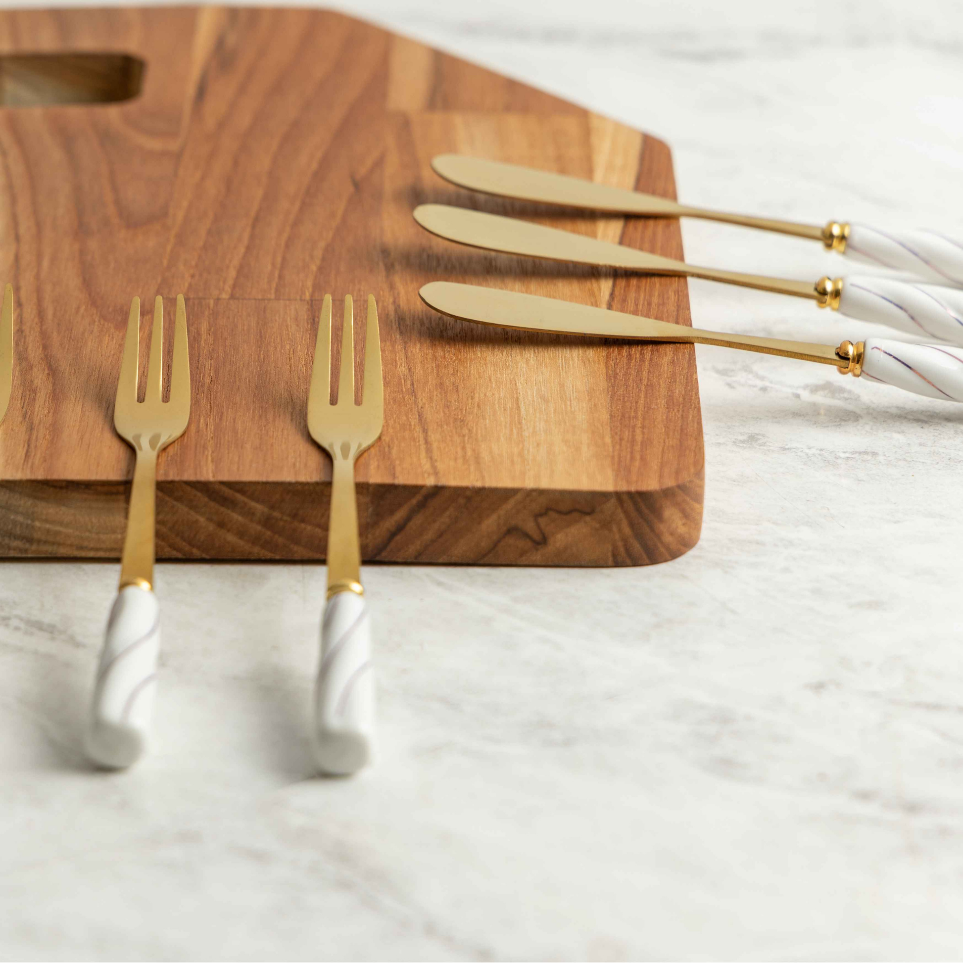 Funcionalidade com requinte. Este conjunto de espátulas transforma o servir em um gesto de elegância. Com lâminas douradas em aço inoxidável e cabos em cerâmica branca, cada peça exibe uma harmonia entre sofisticação e delicadeza. Um toque refinado para ocasiões especiais ou para elevar o dia a dia com estilo.