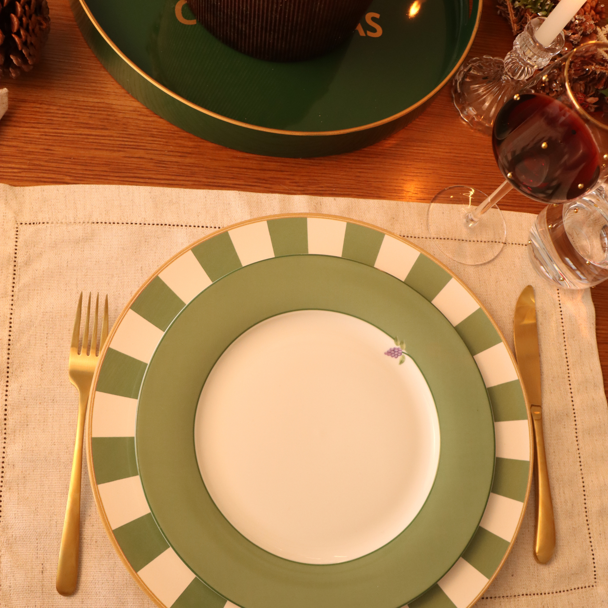 Design Distinto: O prato é decorado com uma elegante borda verde clara e um delicado cacho de uvas, conferindo um toque de frescor e sofisticação.