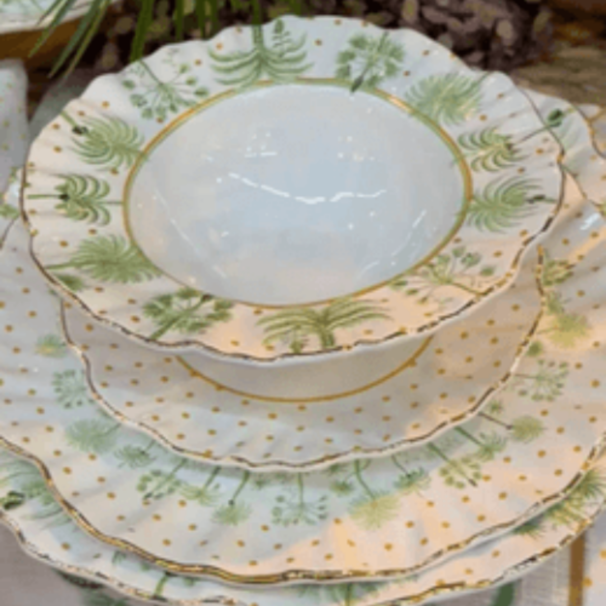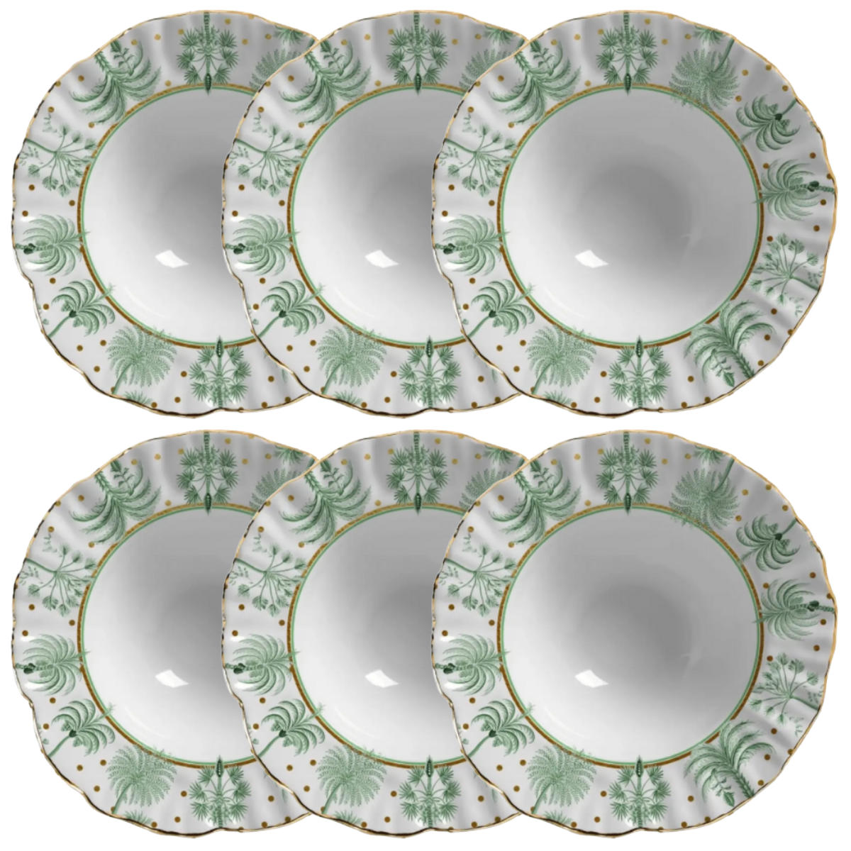 Transforme sua mesa com a sofisticação da Coleção Petir Poá Tropicalle. Com design exclusivo de estampas tropicais — coqueiros e palmeiras em tons de verde e rosa — e detalhes em poás dourados sobre bordas onduladas, essa coleção traz frescor e charme para suas refeições.