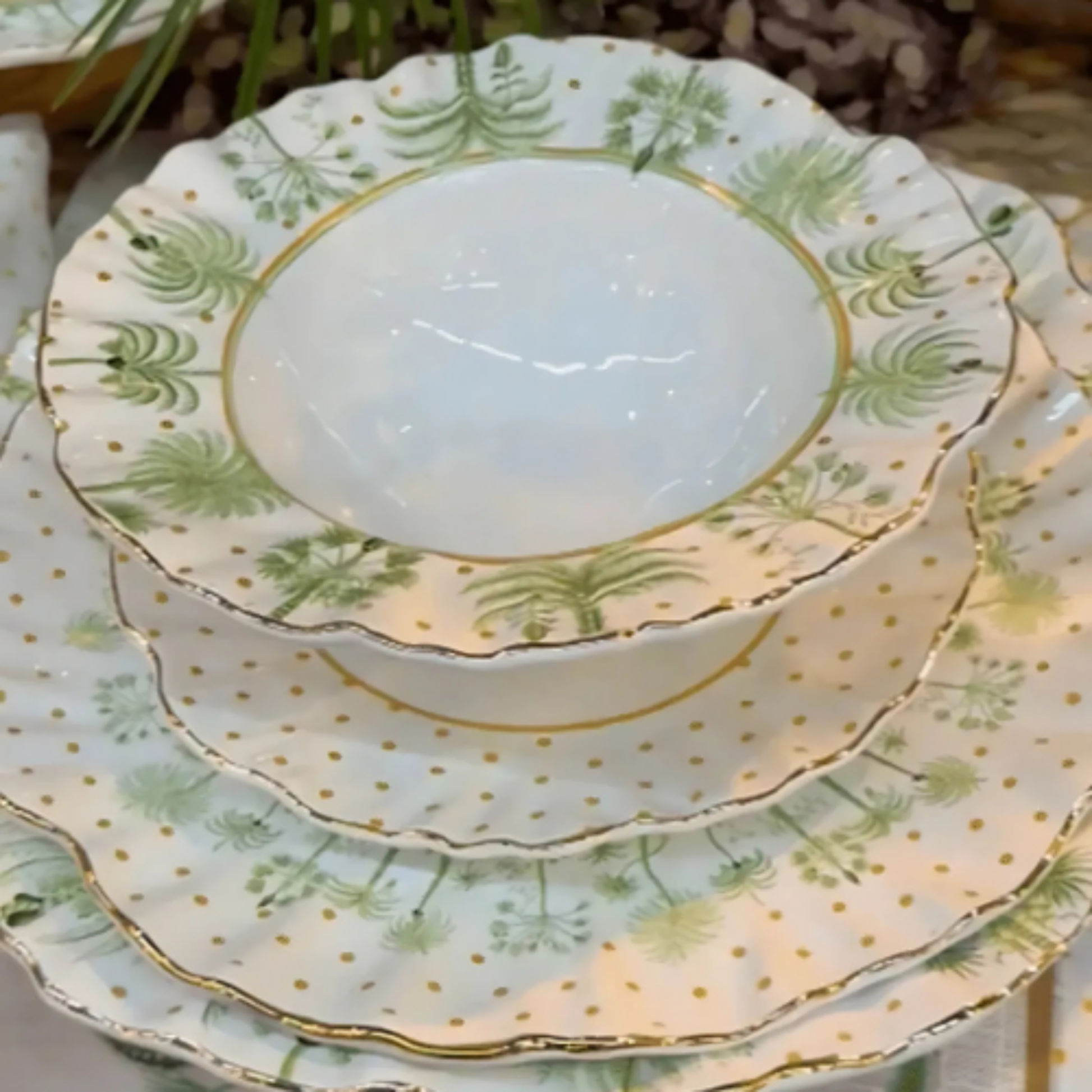 Leve o frescor da natureza para sua mesa com o prato de 28 cm da Coleção Petir Poá Tropicalle. Com estampas de coqueiros e palmeiras em tons suaves de verde e rosa, poás delicados e filetes dourados sobre bordas onduladas, essa peça encanta pelo equilíbrio entre sofisticação e leveza.