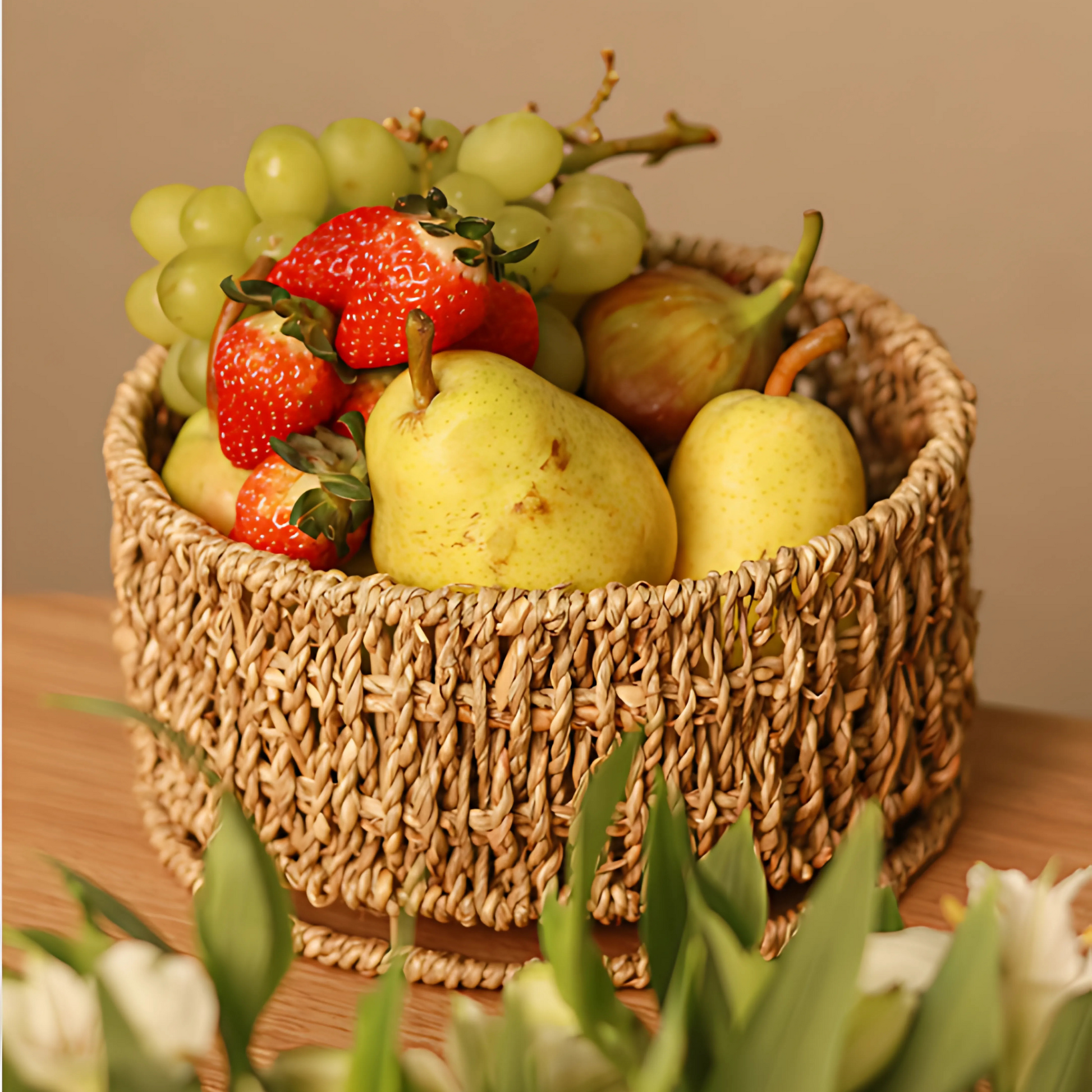Além de servir com estilo, a base em fibras naturais é removível e pode ser utilizada separadamente como uma fruteira, oferecendo ainda mais versatilidade para o seu dia a dia ou para compor a decoração da mesa.