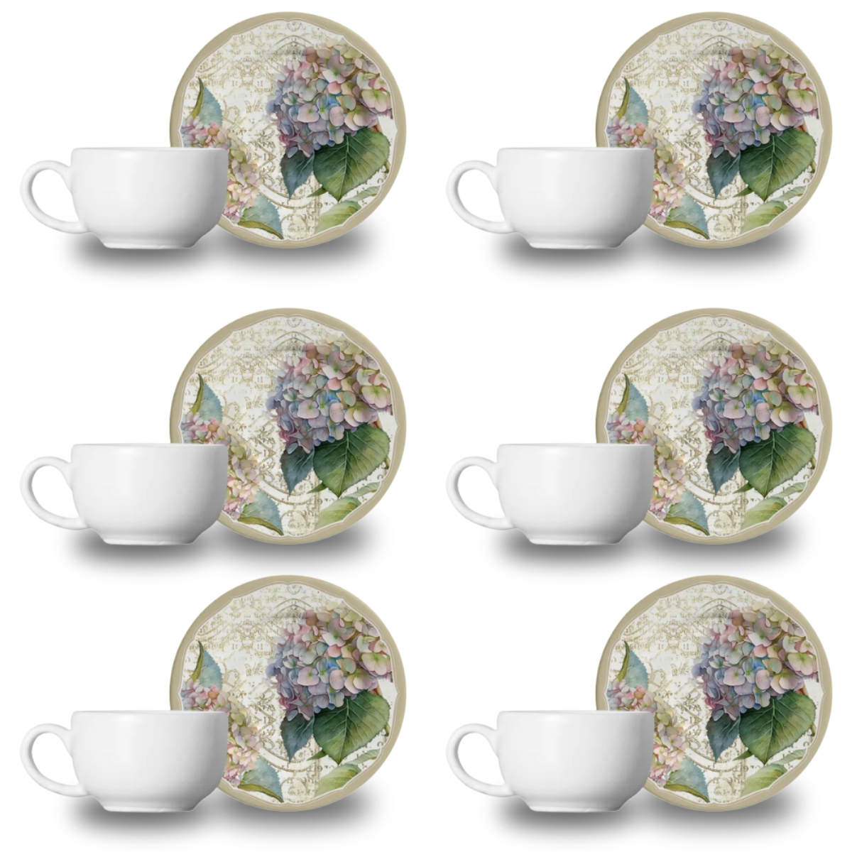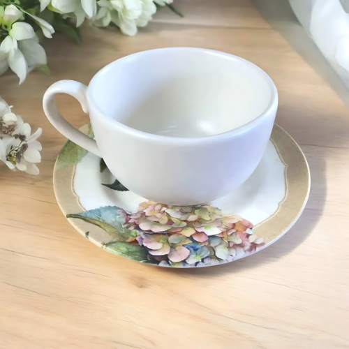 A Xícara de Café com Pires – Hortênsia é uma peça que traduz charme e elegância em cada detalhe. Produzida em cerâmica feldspática branca, com decoração digital sobre base clara, ela é perfeita para tornar o ritual do café ainda mais especial, com um toque floral e refinado.