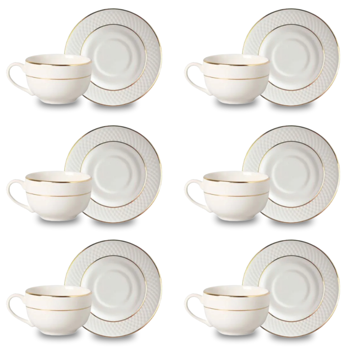 A Xícara de Chá com Pires – Split Gold é uma peça que exala sofisticação e exclusividade. Produzida em cerâmica feldspática branca de alta resistência, ela se destaca pelos detalhes texturizados e pelo filete dourado aplicado manualmente, conferindo um acabamento luxuoso e atemporal.